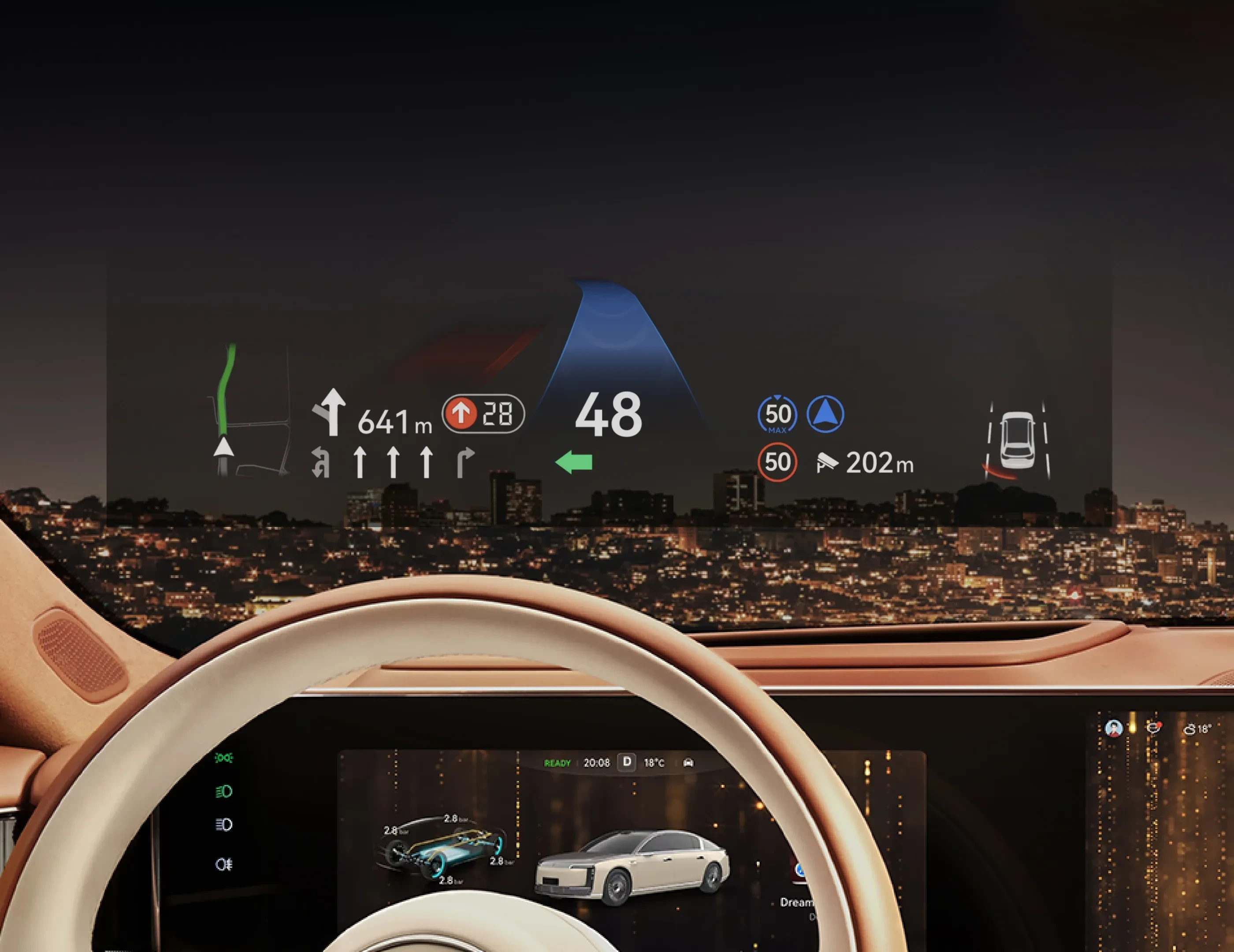 A standard head-up display projects key driving information—such as speed and navigation cues—onto the windshield for enhanced safety and convenience.