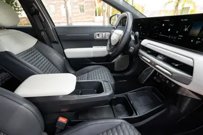 O interior do Kia EV4 Hatchback Standard Range é funcional, com materiais de qualidade média utilizados em todo o habitáculo. Inclui uma consola central flutuante que cria um espaço aberto entre o passageiro e o condutor, oferecendo opções de arrumação convenientes. O design geral prioriza a praticidade e a facilidade de utilização.